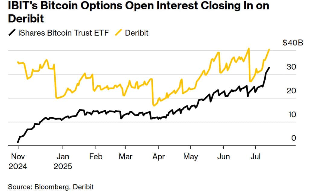 Dla porządku: Deribit nadal jest gigantem wśród opcji na Bitcoina. Ale IBIT szybko dogania giełdę. Dwa światy: jeden z wysoką dźwignią i natywnym BTC jako zabezpieczeniem… Drugi regulowany, z dolarem i ETF-em jako bazą. Brakuje jeszcze pomostu między nimi. Ale ten most się buduje.