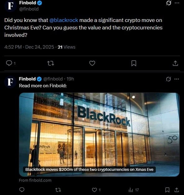 Platforma analityczna Arkham Intelligecne ustaliła, że gigant przeniósł kryptowaluty za ponad 200 mln w dolarów w środę 24 grudnia. BlackRock przetransferował tego dnia 2292 BTC za około 200 mln dolarów oraz 9976 ETH za ponad 30 mln dolarów.