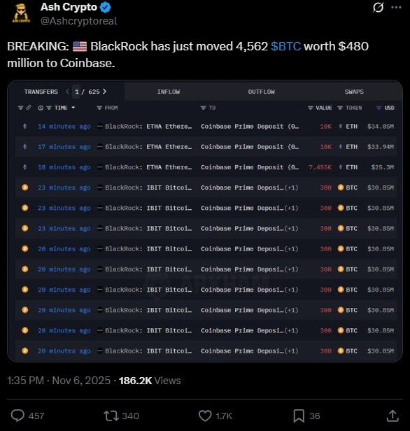 Jak poinformował Ash Crypto w jednym z ostatnich postów na X, wczoraj BlackRock wystawił na giełdę Coinbase 4562 BTC o wartości około 480 mln dolarów. Ten ruch sugeruje, że gigant planuje sprzedaż. To nie jest dobry sygnał dla rynku. Niestety to nie jedyne niepokojące sygnały ze strony tego podmiotu.