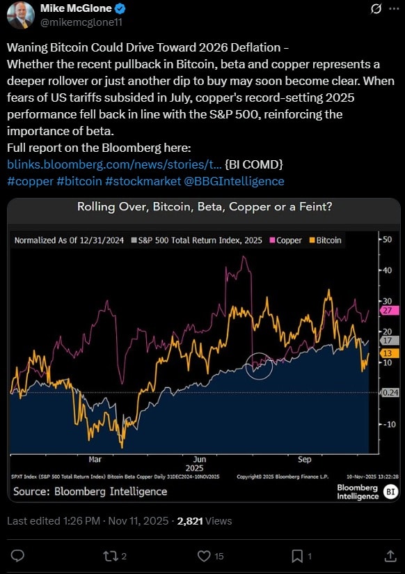 Stanowisko w tej kwestii zajął również Mike McGlone. Starszy strateg ds. surowców w Bloomberg Intelligence ostrzega, że ostatnie słabsze wyniki Bitcoina mogą być dopiero wstępem do potężnego krachu. Ekspert zauważa, że pomimo ogromnych napływów z ETF-ów i innych sprzyjających okoliczności, token osiąga gorsze wyniki w tym roku niż indeks S&P 500. McGlone ocenia, że to w połączeniu z większą zmiennością, to oznaki końca hossy. McGlone niw wyklucza spadku nawet do 50 tys. USD za monetę.