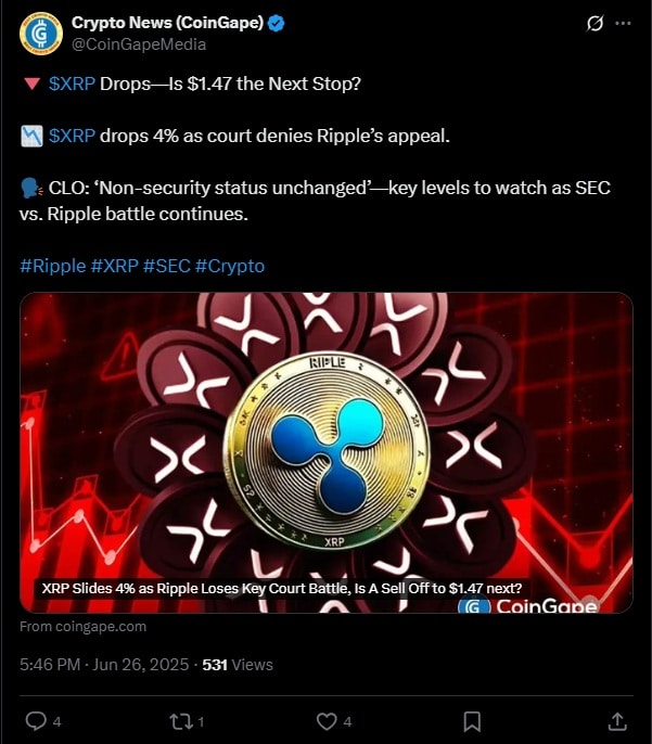 Niestety decyzja sądu okazała się negatywna. Sędzia Analisa Torres odrzuciła wniosek, ponieważ uznała, że jest „proceduralnie niewłaściwy”. Tym samym sędzia podtrzymała dotychczasowy wymiar kary, zgodnie z którym Ripple musi zapłacić 125 mln dolarów kary.