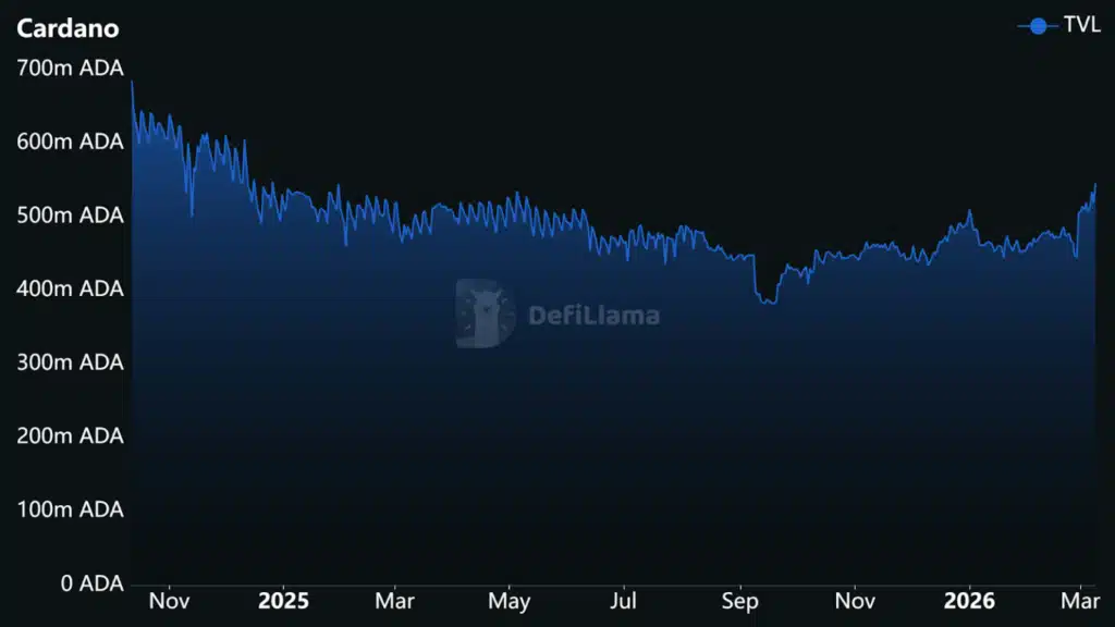 Jednym z najważniejszych sygnałów płynących z sieci jest dynamiczny wzrost wartości środków zablokowanych w ekosystemie Cardano. Według danych platformy analitycznej DeFiLlama całkowity TVL w sieci wzrósł do około 545 milionów ADA. To najwyższy poziom od końca stycznia 2025 roku.