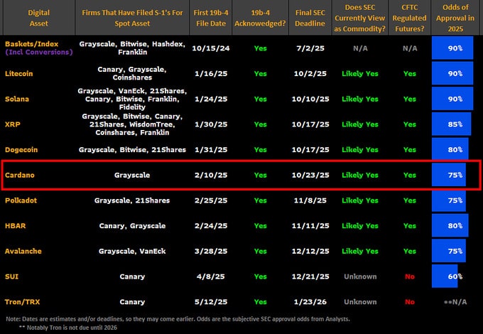 Równolegle do technicznego obrazu, fundamenty ADA wyraźnie się wzmacniają. Najważniejszym katalizatorem pozostaje perspektywa zatwierdzenia ETF-u Grayscale opartego na Cardano. Według analityków Bloomberga szansa na jego akceptację w 2025 roku wynosi obecnie 90%. Co więcej, SEC zdaje się traktować ADA jako towar (commodity), a nie papier wartościowy – to istotna różnica regulacyjna, która może znacząco przyspieszyć proces zatwierdzania.