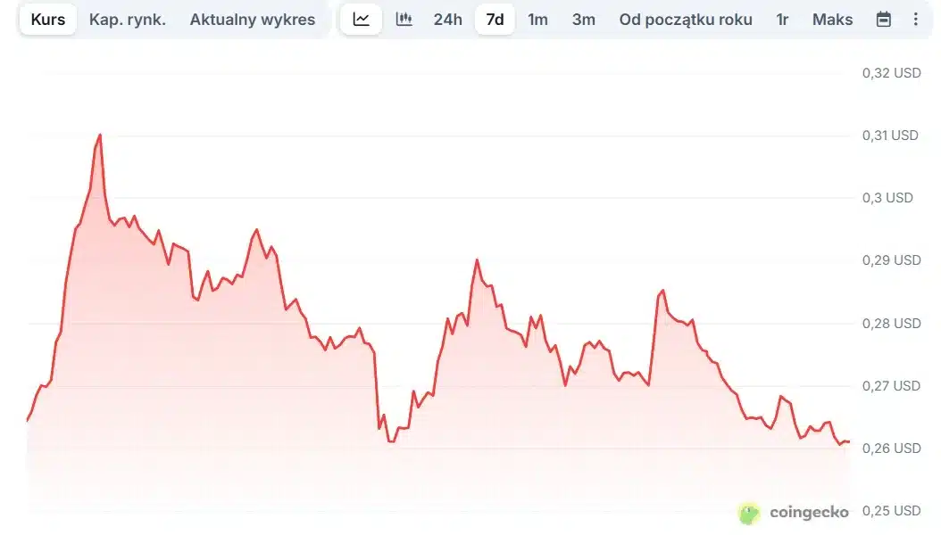 Pod koniec zeszłego tygodnia ADA wrócił do TOP 10, ale problemy projektu jeszcze się nie skończyły. Kurs tokena cały czas jest pod presją. W chwil pisania tekstu Cardano kosztuje 0,26 USD i tylko w ciągu ostatnich 24 godz. spadł o 5,78%. W ujęciu tygodniowym i miesięcznym token spadł odpowiednio o 0,50% oraz 11,01%. Obecnie token spadł do poziomów, które ostatni raz rynek obserwował w październiku 2023 roku.