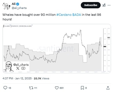 Dodatkową niepewność wzbudzały informację o tym, że duzi posiadacze zaczęli pozbywać się ADA. Ali Martinez przekazał wówczas, że między 6 a 7 stycznia wieloryby pozbyły się aż 70 mln sztuk Cardano. Prawdopodobnie rynek w popłochu próbował zrealizować zyski.