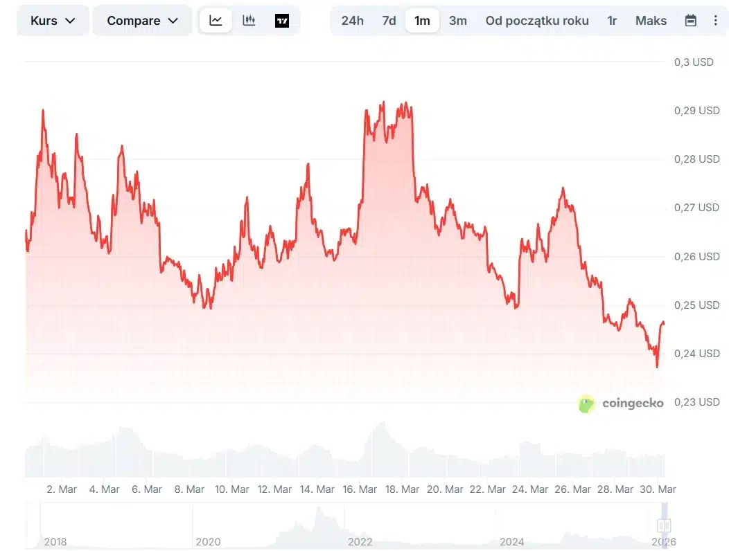 W chwili pisania tekstu ADA kosztuje 0,24 USD i tylko w ciągu ostatnich 24 godzin spadł o 2,12%. Z kolei w ujęciu tygodniowym i miesięcznym token stracił na wartości odpowiednio 6,60% oraz 16,24%. Tylko od początku roku (Year To Date) token stracił na wartości 27,82%. Od ostatniego szczytu z grudnia 2024 roku, gdy altcoin kosztował 1,19 USD, token zaliczył 80% krach kursu. Projekt zaliczył w tym czasie także 79% spadek kapitalizacji rynkowe. Pod koniec 2024 roku Cradano zgromadził 41,93 mld USD, a obecnie ma zaledwie 8,68 mld USD.