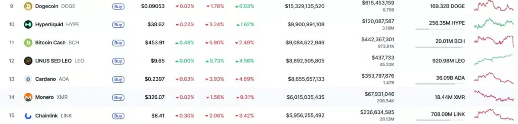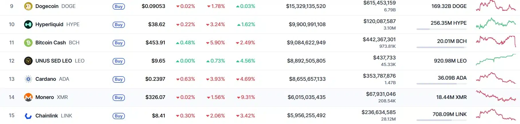 Takie wyniki oznaczają daleko idące konsekwencje. Jedną z najpoważniejszych jest spadek z grona TOP 10 kryptowalut o największej kapitalizacji rynkowej. Kilka tygodni temu ADA ustąpił miejsca Bitcoina Cash. Następnie odzyskał na moment pozycję w TOP 10, a chwilę później przeskoczył go Hyperliquid. W ostatnim tygodniu Cardano nie tylko nie wrócił do elity, ale spadł jeszcze niżej. Obecnie znajduje się na trzynastej pozycji za Hyperliquid, Bitcoin Cash oraz UNUS SED LEO.