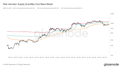 Dane Glassnode pokazują, że cena Bitcoina spadła poniżej 0,75 kwantyla kosztu podaży, wynoszącego około 95 000$, i nie udało jej się powrócić do tego poziomu. Analiza została opublikowana w czwartkowym tweecie przy użyciu modelu kwantylowego kosztu podaży.