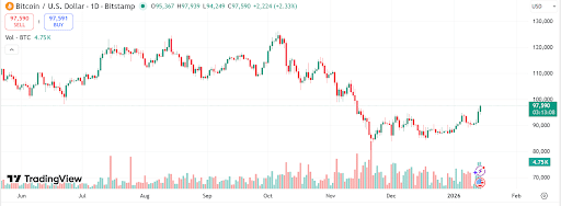 We wtorek Bitcoin w końcu przebił opór na poziomie 95 000 dolarów, rosnąc o 4,5% i zamykając się na poziomie 95 366 dolarów. Choć niektórzy uważali to za przypadek, wczoraj nastąpił wzrost o ponad 2% i odzyskano 97 000 USD.