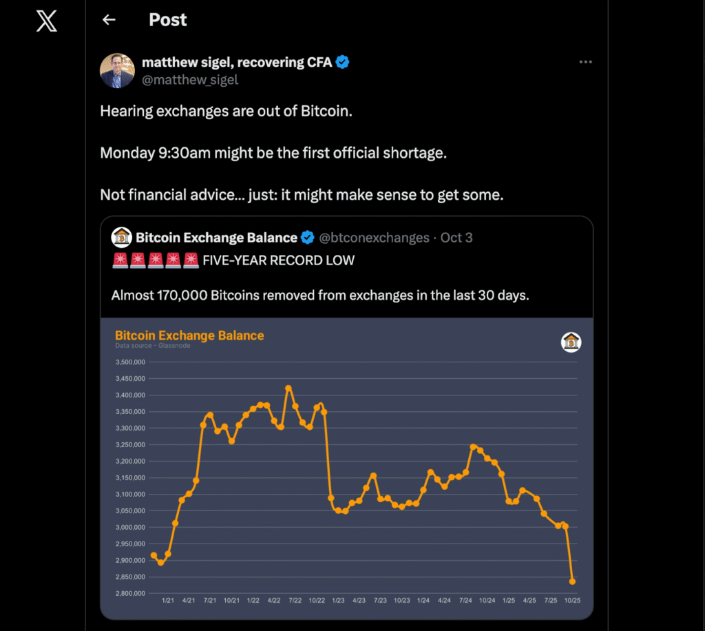 Matthew Sigel z VanEck ostrzegł giełdy, że mogą wkrótce wyczerpać zapasy Bitcoinów. To określa się jako potencjalny „niedobór”.