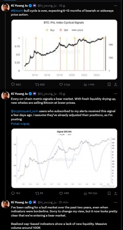 Ki Young Ju napisał: „Wzywałem do hossy przez ostatnie dwa lata, nawet gdy wskaźniki były na granicy. Przykro mi zmieniać pogląd, ale teraz wygląda na to, że dość wyraźnie wkraczamy w rynek niedźwiedzia.