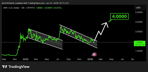 Cena XRP wynosi około 1,94$, co oznacza niewielkie odbicie po ostatnich spadkach. Analitycy rynkowi zwracają uwagę, że po silnym wzroście XRP przez wiele miesięcy znajdowało się w kontrolowanym kanale spadkowym. Podobne wzorce z przeszłości poprzedzały gwałtowne wzrosty, gdy presja sprzedaży słabła. Analityk kryptowalut DonWedge udostępnił niedawno 12-godzinny wykres przedstawiający tę sytuację. Zauważył, że XRP wcześniej wzrosło z 0,49$ do ponad 3$ po wyjściu z podobnej struktury. Obecna konsolidacja trwa już prawie sześć miesięcy, a zmienność spada w pobliżu dolnej granicy kanału. Potwierdzone wybicie mogłoby spowodować wzrost do poziomu 4$, co wymagałoby wzrostu o nieco ponad 100%.