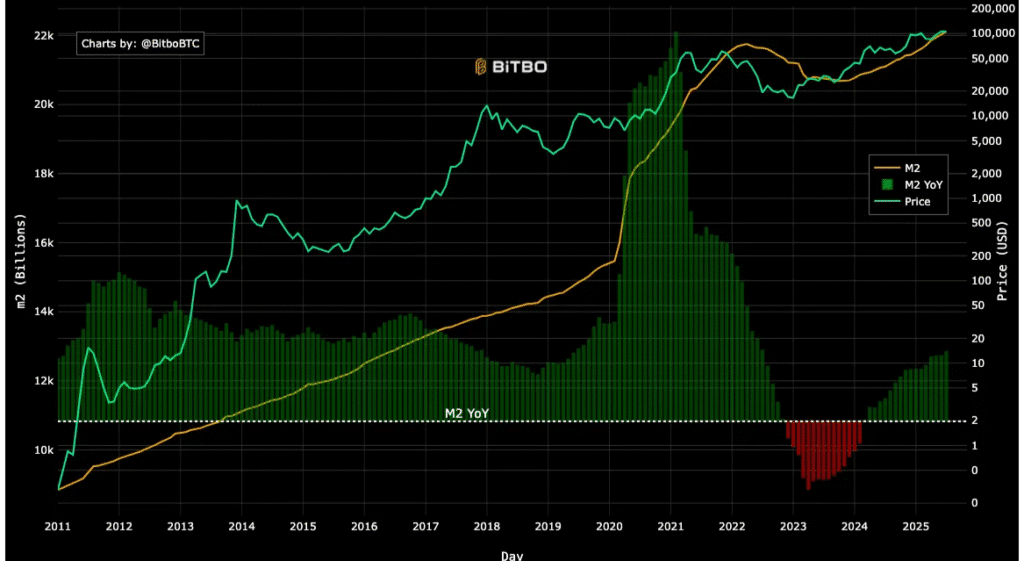 Takie decyzje w przeszłości prowadziły do osłabienia dolara, co sprzyjało kryptowalutom, zwłaszcza Bitcoinowi. Wzrost podaży pieniądza w USA (M2) historycznie korelował z rosnącym kursem BTC, ponieważ inwestorzy traktowali go jako alternatywne aktywo chroniące przed inflacją. Jednak tym razem rynek jest bardziej ostrożny.