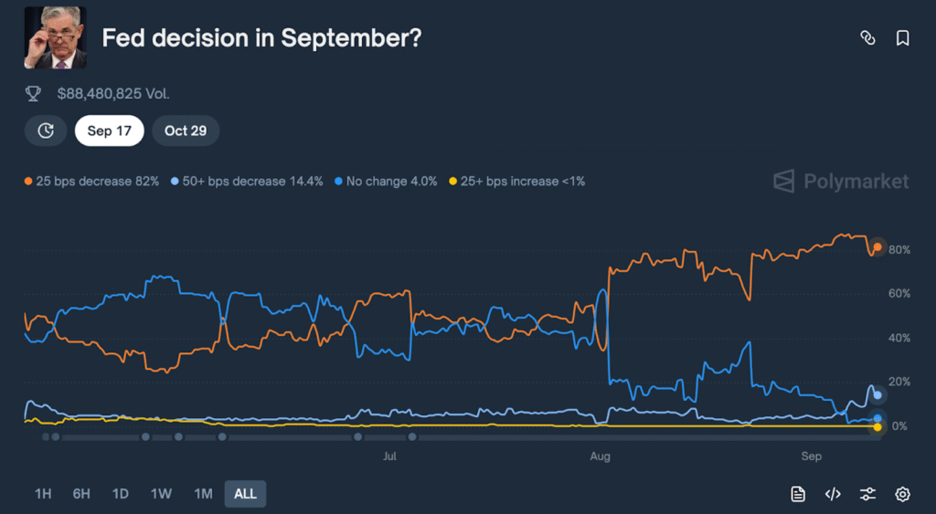 Analitycy spekulują, że Rezerwa Federalna (FOMC) na posiedzeniu w dniach 17–18 września zdecyduje się na obniżkę stóp procentowych o 25 punktów bazowych, co według platformy predykcyjnej Polymarket ma aż 83% prawdopodobieństwa. Zdaniem wielu ruch na kryptowalutach zmniejszył się celowo w oczekiwaniu na ważne dane.