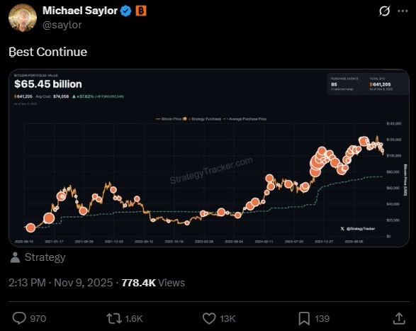 Okazała się, że ostatecznie MicroStrategy wróciła do kupowania, co było ważnym sygnałem dla rynku. 3 listopada firma poinformowała, że nabyła kolejne 397 BTC za około 45,6 mln USD. Średnia cena z token wyniosła 114 771 USD. Na dzień 2 listopada 2025 r. gigant miał w portfelu 641 205 BTC nabytych za około 47,49 mld USD. Średnia cena za jednego BTC, które do tej pory płacił MSTR to 74 057 USD.