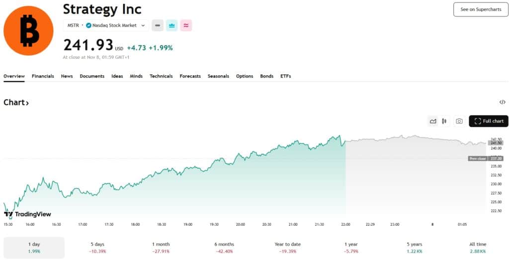 W chwili pisania tekstu akcje MSTR kosztują na giełdzie 241,93 USD. W ciągu ostatniej dobry zyskał na wartości 1,99%. Jednak zarówno przez ostatni tydzień, jak i miesiąc regularnie spadały. W trakcie ostatniego tygodnia akcje MSTR straciły 10,39%. Natomiast przez ostatni miesiąc akcje giganta spadły o 27,91%. Nie najlepiej wygląda też wskaźnik YTD (Year To Date). Od początku roku akcje MicroStrategy straciły na wartości 19,39%.