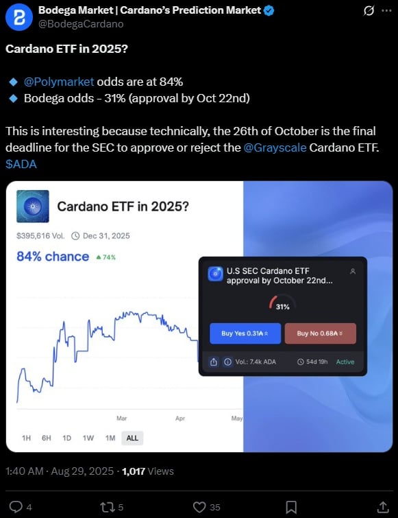 Dane z Polymarket wskazują, że rynek ocenia szanse na pozytywną decyzję na 84%. Również analitycy oczekują raczej zatwierdzenia tego funduszu. Jak ocenia crypto.news Cardano jest popularną kryptowalutą, podobną do Ethereum. Ponadto jest to token o wysokiej płynności, z dziennym wolumenem obrotu przekraczającym 1,3 miliarda dolarów. Dlatego obserwatorzy oceniają, że SEC będzie raczej skłonna dopuścić ADA ETF od Grayscale do obiegu.