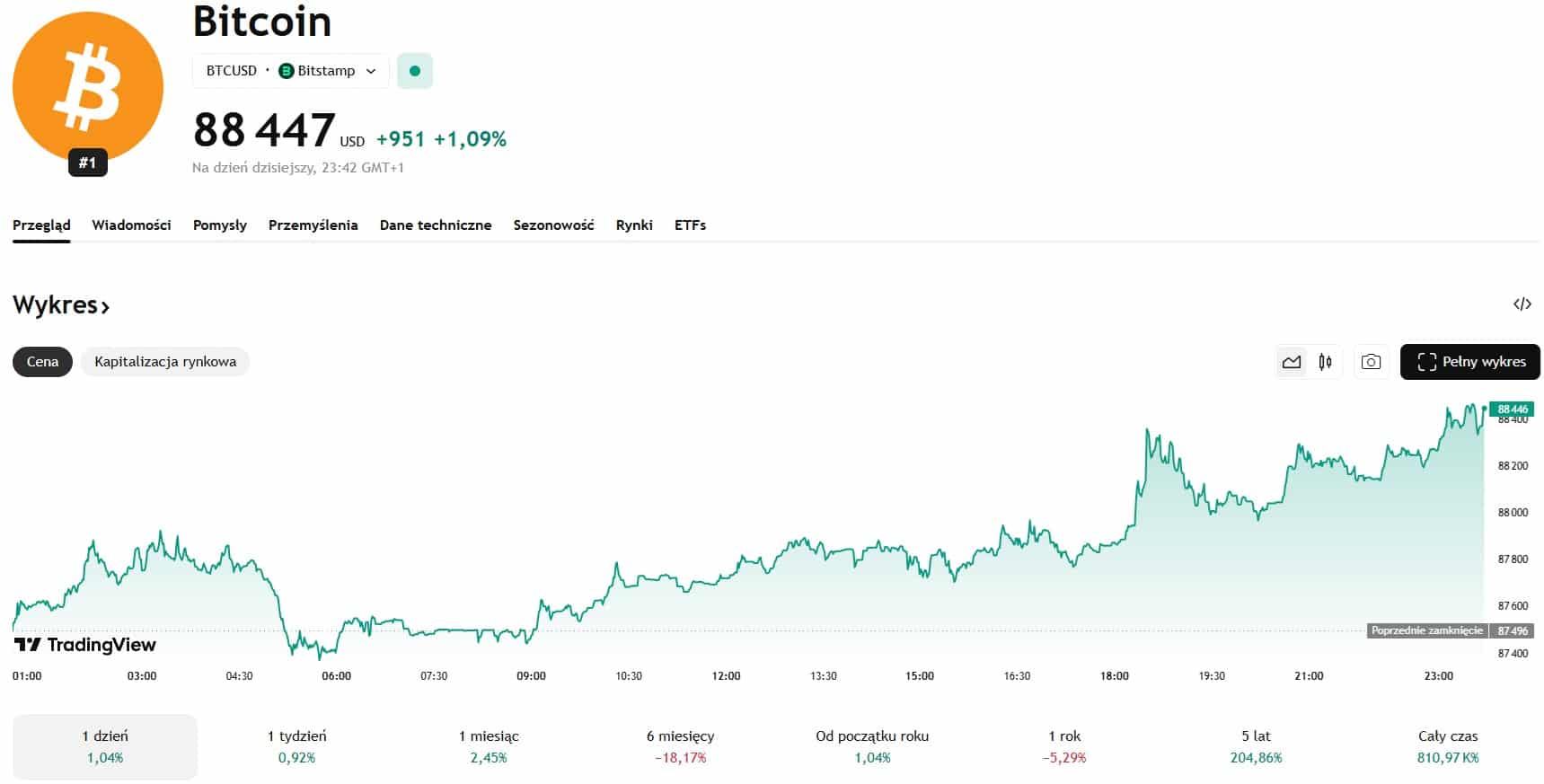 W chwili pisania tekstu cena Bitcoina wynosi 88 747 dolarów, a w ciągu ostatnich 24 godzin skoczyła o 1,04%. W ujęciu tygodniowym i miesięcznym kurs BTC wzrósł odpowiednio o 0,92% oraz 2,45%. Natomiast w ujęciu rocznym token traci na wartości 5,29%.