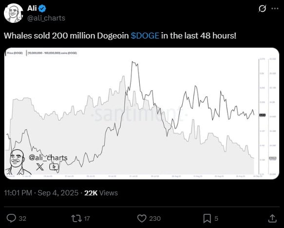 Niestety najnowsze wiadomości należy potraktować raczej jako ostrzeżenie, niż zwiastun poprawy. Jak poinformował Ali Martinez w jednym z ostatnich wpisów na X, zaledwie w ciągu 48 godzin duzi posiadacze pozbyli się łącznie 200 mln sztuk DOGE. Dane, które rozpowszechnił Martinez, pochodzą z renomowanej platformy analitycznej „Santiment”.