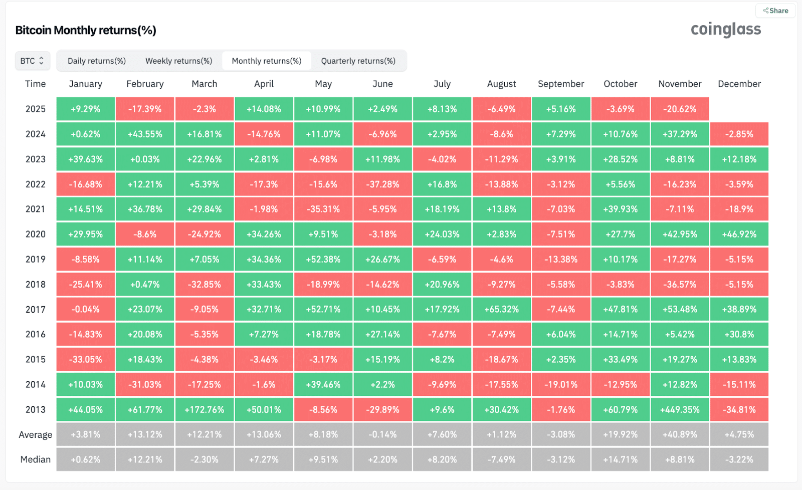 Październik był tradycyjnie jednym z najlepszych miesięcy dla inwestorów Bitcoina i przynosił jedne z najwyższych zwrotów z inwestycji. Dane z CoinGlass wskazują na średnio około 20% w październiku i aż 40% w listopadzie. Jednak rok 2025 to ponad 20% na minusie w listopadzie.