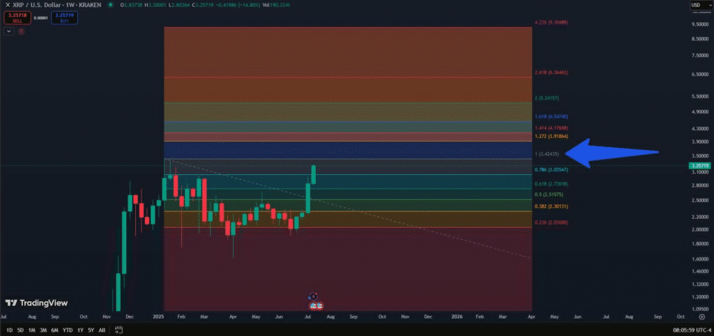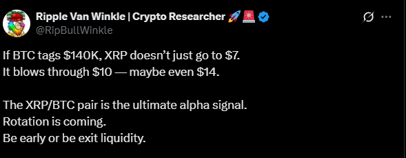 W szczególności, badacz kryptowalut Ripple Van Winkle przewidział w niedawnym poście na X, że XRP nie zatrzyma się na 7 USD, gdy Bitcoin osiągnie 140 000 USD, ale będzie maszerował dalej do 10 USD. Podzielił się, że może nawet wzrosnąć dalej, aby osiągnąć nowy rekord wszechczasów w wysokości 14 USD, który jest o około 297% wyższy niż jego obecna cena.