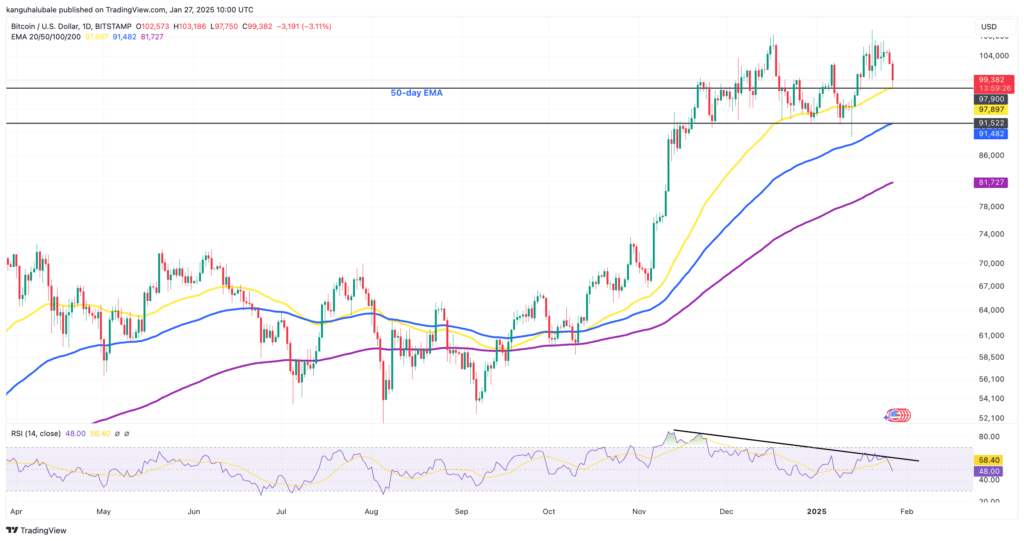Zdaniem Michaela van de Poppe, założyciela MN Capital, obecna wyprzedaż jest jedynie krótkoterminowym szokiem i paniką na rynkach. Wskazuje on, że przedział 98 000–99 000 USD stanowi atrakcyjną strefę wejścia dla inwestorów instytucjonalnych. Jednocześnie ostrzega, że jeśli w tym rejonie nie pojawi się silne wsparcie kupujących, Bitcoin może spaść do poziomu 89 500–91 500 USD. Technicznie kluczowym poziomem wsparcia pozostaje 50-dniowa wykładnicza średnia krocząca (EMA) na poziomie 97 900 USD. Utrata tego wsparcia może skłonić rynek do dalszej przeceny w kierunku 100-dniowej EMA na poziomie 91 482 USD, co byłoby istotnym testem dla byków.