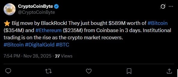 Wygląda na to, że jednak to był fałszywy alarm, ponieważ gigant znowu kupuje. Jak ustaliła platforma Onchain Lens BlackRock nabył w piątek kryptowaluty za 589 milionów dolarów. Firma pozyskała BTC o wartości 354 milionów dolarów, a także Ethereum o wartości 235 milionów dolarów.