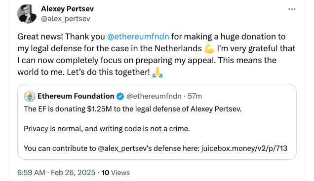 Fundacja Ethereum (EF) ogłosiła przekazanie 1,25 miliona dolarów na wsparcie obrony prawnej dewelopera Tornado Cash, Aleksieja Pertseva, który przygotowuje się do odwołania od wyroku skazującego za pranie pieniędzy w Holandii. W ogłoszeniu z 26 lutego EF podkreśliła: