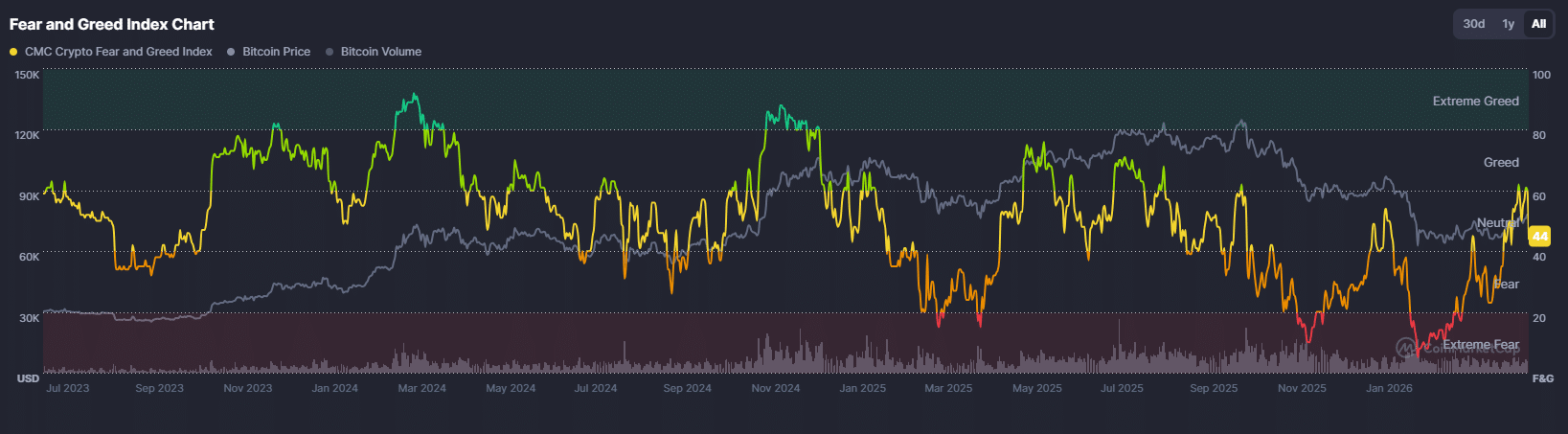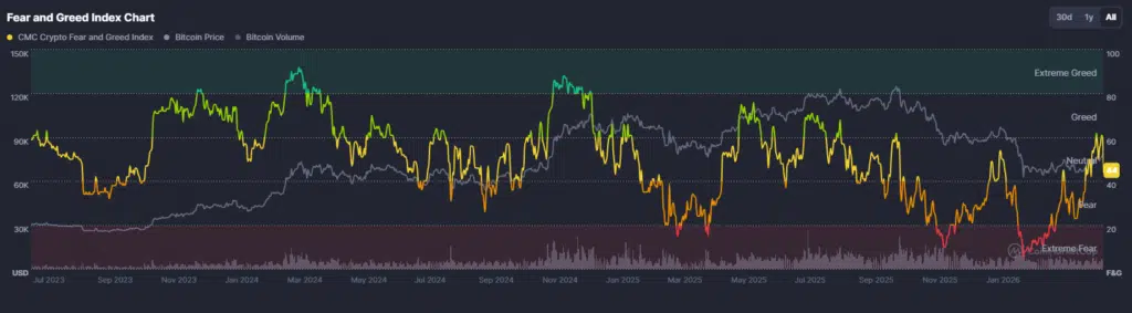Nastroje wokół kryptowaluty Bitcoin (BTC) zmieniły się drastycznie w ciągu ostatnich dwóch tygodni. Wskaźnik Fear & Greed (strachu i chciwości) mierzący generalny sentyment na rynku wzrósł z przedziału 25–30 w połowie kwietnia do około 50–60 punktów – to najwyższy odczyt od trzech miesięcy. Za tym przesunięciem stoją przede wszystkim twarde dane o przepływach kapitału.