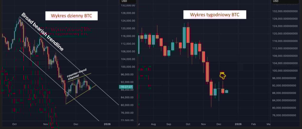 Mimo że Bitcoin wycofał się z 93 000 USD do poziomu poniżej 90 000 USD, a nastąpiło to pomimo osłabienia dolara po decyzji Rezerwy Federalnej, to nastroje pozostają napięte. Trwające od trzech tygodni odbicie cen Bitcoina, który od 21 listopada zdołał wzrosnąć z 80 000 USD, wydaje się być zagrożone odwróceniem trendu. Nasdaq, indeks obciążony spółkami technologicznymi, napotkał w ubiegłym tygodniu poważny opór, co jest sygnałem potencjalnych kłopotów, a w przeszłości silna korelacja między tymi aktywami często prowadziła do spadków Bitcoina, które były amplifikacją ruchów na NDX.