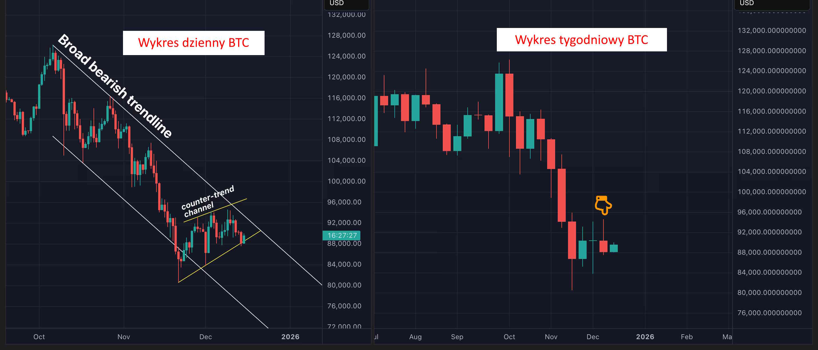 Analityk CoinDesk i technik rynku Omkar Godbole ostrzega, że połączenie tego wzoru z zatrzymaniem odbicia na Nasdaq zwiększa ryzyko głębszego spadku Bitcoina w kierunku 80 000 USD.