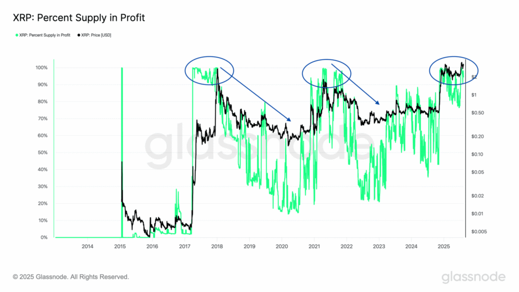 Dane z Glassnode wskazują, że ponad 95% XRP znajdujących się w obiegu jest obecnie na wirtualnym zysku. W przeszłości taki stan często prowadził do zwiększonej presji sprzedażowej, gdy inwestorzy decydowali się realizować zyski.