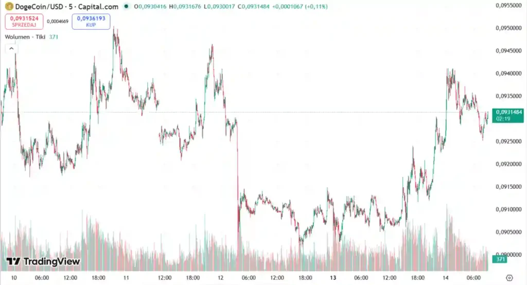 Silna aktywność instytucjonalna wypchnęła notowania Dogecoina z fazy konsolidacji ale prawdziwy test siły popytu znajduje się tuż powyżej obecnych poziomów cenowych. Warto zauważyć że Dogecoin pnie się w górę przy solidnym wolumenie obrotu co sugeruje że ruch ten jest poparty realnym kapitałem a nie tylko chwilową fluktuacją. Token pozostaje jednak ograniczony poniżej kluczowego oporu w okolicach 0,094 USD do 0,095 USD co utrzymuje szerszy schemat w skompresowanej i jeszcze niepotwierdzonej fazie wybicia. Traderzy bacznie obserwują wsparcie w pobliżu 0,0925 USD oraz opór na poziomie 0,094 USD ponieważ przebicie któregoś z tych poziomów prawdopodobnie zdefiniuje kolejny duży ruch cenowy. Aktywność inwestorów sugeruje konstruktywną strukturę wzrostową ponieważ cena utrzymuje zyski zamiast gwałtownie tracić po lokalnych szczytach.