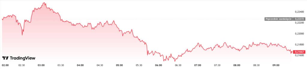 Załamanie się ceny z poziomu 23 centów anulowało poprzednią byczą strukturę, a 22 centy stały się nowym, krótkoterminowym dnem. Gwałtowny wzrost wolumenu handlu do 782 milionów dolarów może świadczyć o kapitulacji wielu inwestorów, co często bywa prekursorem do formowania się dna i późniejszego odwrócenia trendu. W najbliższym czasie kluczowe będzie utrzymanie wsparcia na poziomie 22 centów; jeśli presja na sprzedaż utrzyma się, kolejnym poziomem do obserwacji będzie 21 centów. Immediate opór znajduje się na 23 centach, a jego przełamanie byłoby sygnałem do większego odbicia. Głównym progiem do przełamania w celu powrotu na ścieżkę wzrostu pozostaje poziom 25 centów.