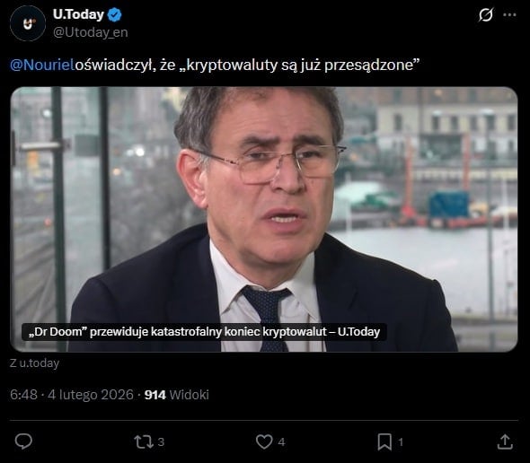 Ekonomista działający pod pseudonimem Dr Doom prognozuje, że kryptowaluty czeka „katastrofalny koniec”. Nouriel wskazuje, że oczekiwania były ogromne, a wielu oczekiwało nawet 200 tys. USD za Bitcoina. Przypomina również, że całą branżę miał pompować nowy rząd, który wiele obiecywał. Jednak pomimo podjęcia pewnych działań rynek się załamał. Od szczytu z października Bitcoina stracił około 35%, a we wtorek osiągnął najniższy poziom od 2024 roku.
