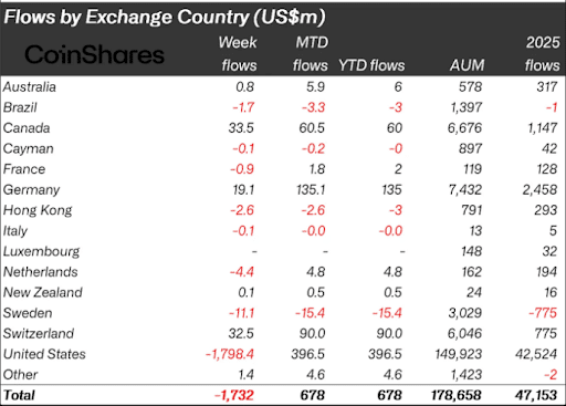CoinShares podaje, że Stany Zjednoczone odnotowały odpływ środków o wartości prawie 1,8 mld dolarów. To czyni je głównym celem globalnego wycofywania się inwestorów w zeszłym tygodniu. Analitycy łączą to z rosnącą niepewnością regulacyjną oraz coraz dłuższą listą problemów politycznych i gospodarczych.