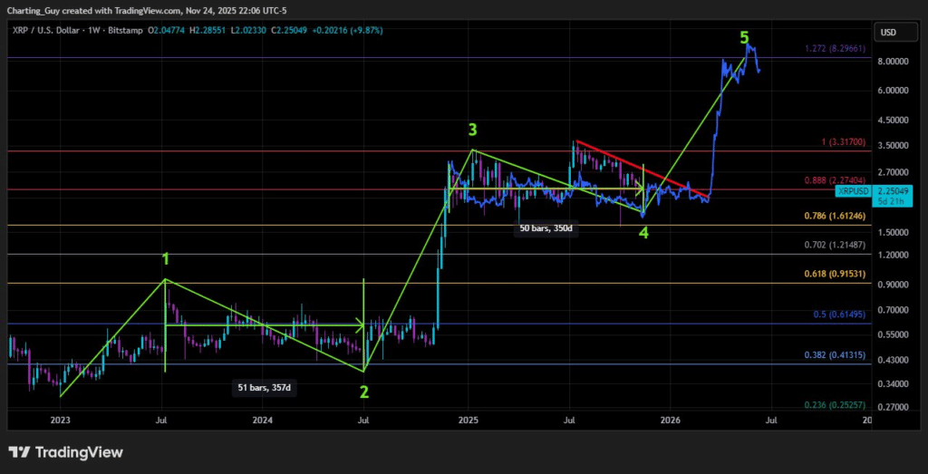 Charting Guy, opierając się na długoterminowych wzorcach wykresów, przewiduje cenę XRP na poziomie 8 USD od 2024 r. XRP porusza się w ramach wieloletniego trendu wzrostowego, który rozpoczął się w 2023 r., z okresami ruchu bocznego przed każdym większym przełamaniem. Te fazy ruchu bocznego pozwalają rynkowi „akumulować” XRP przed kolejnym wzrostem.