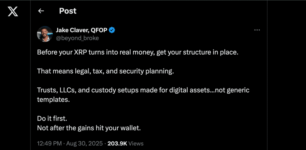 Claver przestrzegł, że posiadacze XRP powinni mieć swoje struktury na wczesnym etapie, obejmujące kwestie prawne, podatkowe i strategie bezpieczeństwa. Wyjaśnił, że powiernictwa, spółki LLC i rozwiązania w zakresie opieki muszą być dostosowane do aktywów cyfrowych, a nie kopiowane z przestarzałych szablonów finansowych. Dzięki temu zasoby prawnie są chronione, korzystne podatkowo i wolne od ryzyka charakterystycznego dla kryptowalut.