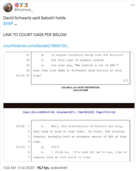 Właśnie w tej części zeznań Schwartz niespodziewanie stwierdził: „Satoshi, pierwotny twórca Bitcoina, prawdopodobnie posiadał wówczas ogromną ilość XRP”. Zapytany, o który rok mu chodzi, odpowiedział „2017”. Komentarz ten, choć nie miał kluczowego znaczenia dla sprawy, wzbudził duże zainteresowanie ze względu na swoje implikacje i długotrwałą tajemnicę otaczającą tożsamość Nakamoto.
