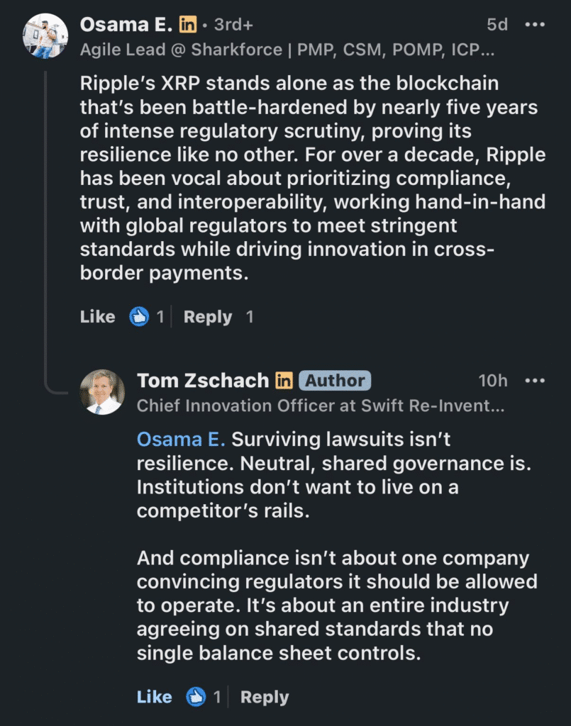 Dyrektor ds. innowacji w SWIFT, Tom Zschach, skrytykował Ripple i XRP. Ekspert twierdzi, że samo przetrwanie procesów sądowych nie jest dowodem prawdziwej odporności.