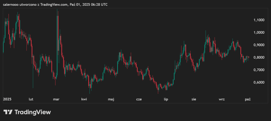 Przebicie linii trendu, która od czerwca trzymała ADA przy życiu i z nadziejami na lepsze jutro, otwiera drogę do testu 69 centów. To wsparcie, które wcześniej zatrzymało spadki, ale jeśli i ono pęknie, na horyzoncie rysuje się nawet 0,53$. To z kolei poziom, z którego Cardano w tym roku już się odbiło, więc jego utrata mogłaby mocno uderzyć w nastroje.
