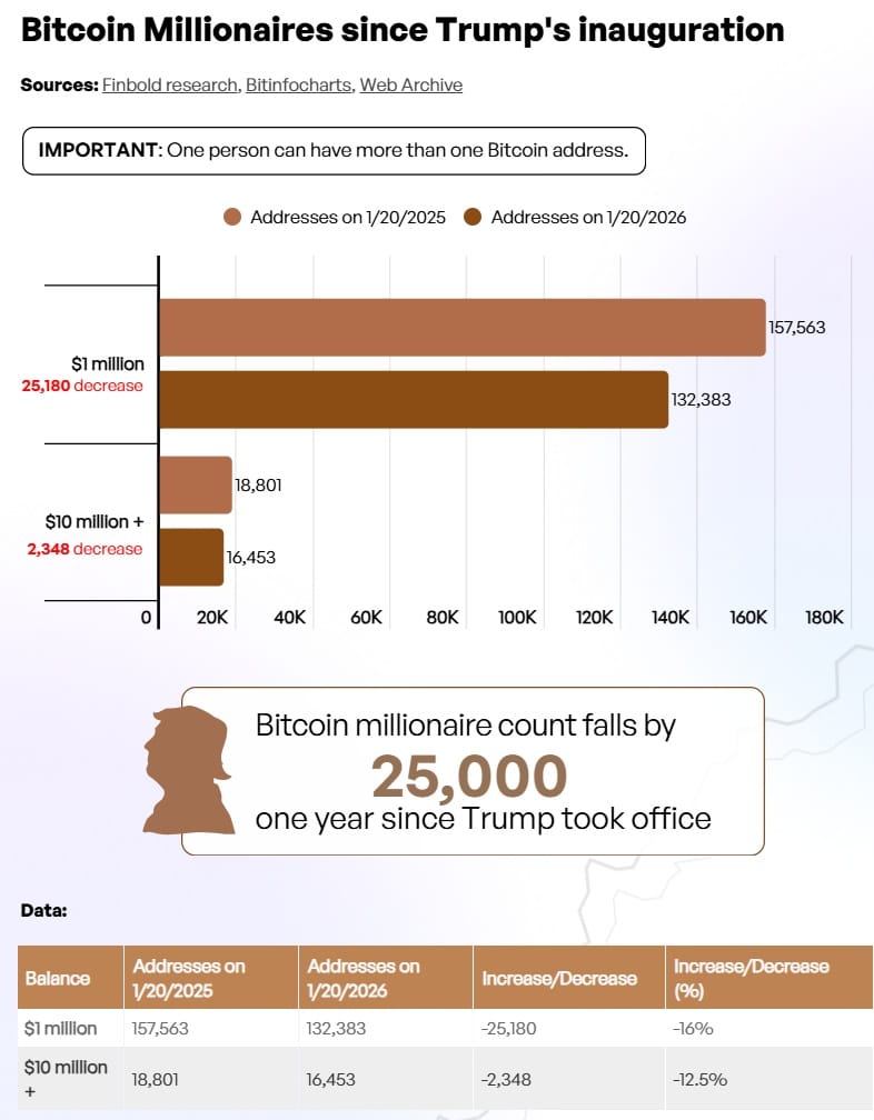 Finbold przeanalizował dane blockchain z tego okresu i nie wygląda to optymistycznie. W ciągu ostatniego roku, po objęciu prezydentury przez Donlada Trumpa, liczba adresów kryptowalutowych milionerów spadła aż o 25 tys. Co więcej, w momencie, gdy Donald Trump drugi raz obejmował fotel prezydenta USA, istniało 157 563 adresów Bitcoin, na których znajdowały się BTC o wartości co najmniej 1 miliona dolarów. W styczniu 2026 roku, czyli po roku jego prezydentury, liczba ta spadła do 132 383 adresów. To oznacza, że liczba adresów, które posiadają BTC o wartości minimum 1 mln dolarów, spadła o 25 180. To spadek o około 16%.