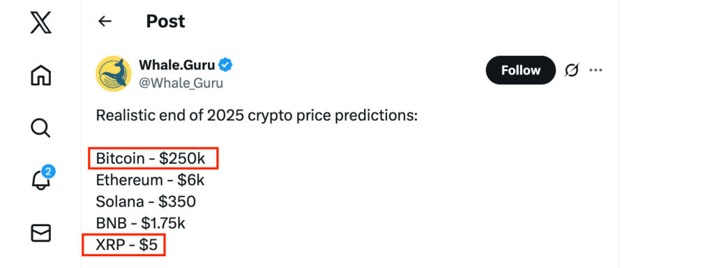 Analityk kryptowalut Whale.Guru wierzy, że jeśli Bitcoin urośnie do 250 000 dolarów, XRP może osiągnąć cenę 5 dolarów do końca 2025 roku. To ponad dwukrotnie więcej niż obecnie 2,47 dolara.