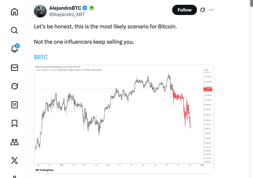 Uważa, że Bitcoin może spaść nawet do 79 000 dolarów w ciągu najbliższych trzech miesięcy. Wskazuje na historyczne cykle korekcyjne, które nastąpiły po poprzednich szczytach hossy. „Bitcoin zawsze przechodził przez wielomiesięczne okresy ochłodzenia przed kolejnym wzrostem” – wyjaśnił Alejandro.