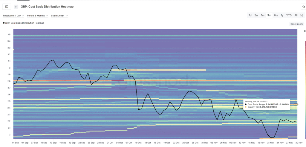 Kluczowy węzeł kosztów nabycia znajduje się między 2,445 a 2,460 USD, gdzie skupione jest ok. 1,75 mld XRP. To właśnie ta strefa stanowi główny opór, który musi zostać przebity, by potwierdzić sygnał wzrostowy.