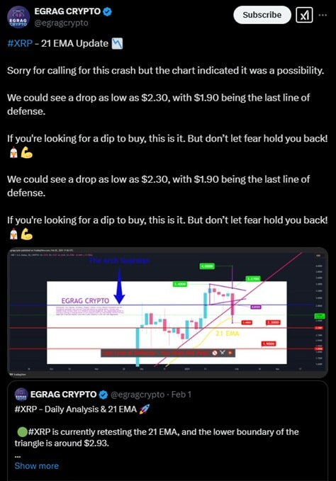 Co ciekawe, taki rozwój sytuacji dość precyzyjnie przewidział ERGAG CRYPTO. W sobotę 1 lutego popularny ekspery rynku kryptowalut ostrzegał, że XRP może zaliczyć krach, który w skrajnym przypadku sięgnie okolic 1,90 USD. Jednocześnie analityk przestrzegał, by nie panikować i raczej wykorzystać tę sytuację do zakupów po niższej cenie.