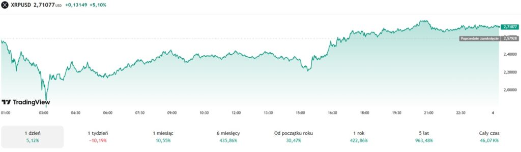 W poniedziałek 3 lutego kilka minut po godzinie 3:00 nad ranem token spadł do 1,80 USD. Poprzedni dzień XRP zamknął w na poziomie 2,60 USD. Oznacza to, że w mniej więcej trzy godzin Ripple spadł aż o 30%. Finalnie altcoin doświadczył silnego odbicia i zakończył dzień z wynikiem 2,70 USD i zanotował dzienny wzrost o 5,12%. Jednak na przestrzeni całego tygodnia moneta spadła o 10,19%. Szczególnie bolesna jest utrata poziomu trzech dolarów.