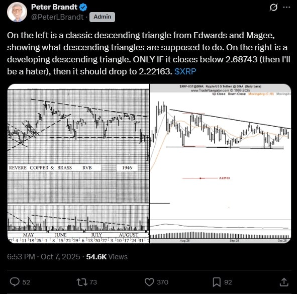 Zaczęło się dziać coś niepokojącego, a może być gorzej. Swoją analizę dla XRP zaprezentował Peter Brandt. Ceniony ekspert przedstawił w jednym z ostatnich postów na X scenariusz, w którym Ripple spada do 2,22 USD. Zdaniem eksperta na wykresie kryptowaluty tworzy się formacja trójkąta zstępującego, która sygnalizuje osłabienie trendu wzrostowego. Brandt ocenia, że jeśli ta formacja się rozwinie, a token zamknie się poniżej 2,68743 USD, to jego cena spadnie do 2,22 USD.