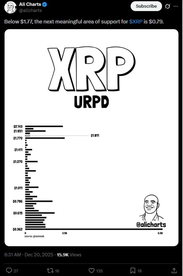 Pomimo utrzymujących się dodatnich napływów do ETF-ów, perspektywy dla kryptowaluty nie są zbyt optymistyczne. Ali Martinez w jednym z ostatnich postów na X ostrzegł przed głęboką koretką tokena. Popularny ekspert rynku kryptowalut wskazał 1,77 USD jako kluczowy poziom wsparcia. Martinez ocenia, że w najczarniejszym scenariusz, utrata tego poziomu oznacza spadek do 0,79 USD.