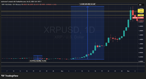 Rector zauważył, że ostatni trend podąża za tym samym schematem. W październiku tego roku cena XRP spadła o prawie 50%, po czym odbiła się do obecnej ceny około 2,45 USD.